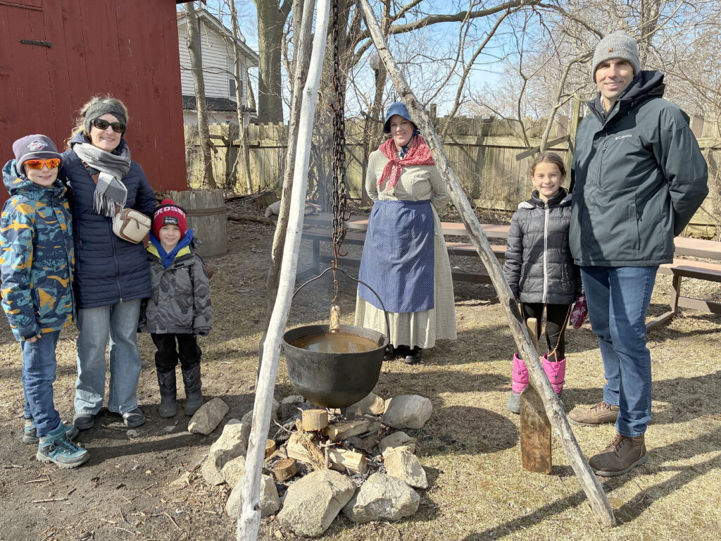 Costumed interpreter Kim Morrison (middle) provided a demonstration of how sap was put through an evaporation process while working towards a treasured bit of maple syrup. Enjoying the information session was the Djurdjevic family, from left, Alex, Megan, George, Angela and Sinisa.